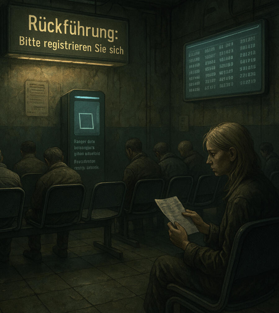 Metallene Stühle in endlosen Reihen. Monitore, die keine Namen zeigen, nur Codes, Farben, Fehler.